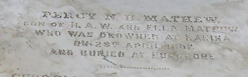 BELOW: PERCY N H MATHEW Son of H A W Mathew and Ella Mathew who was drownedat Kakina on 28th April 1887? and buried at ......pore